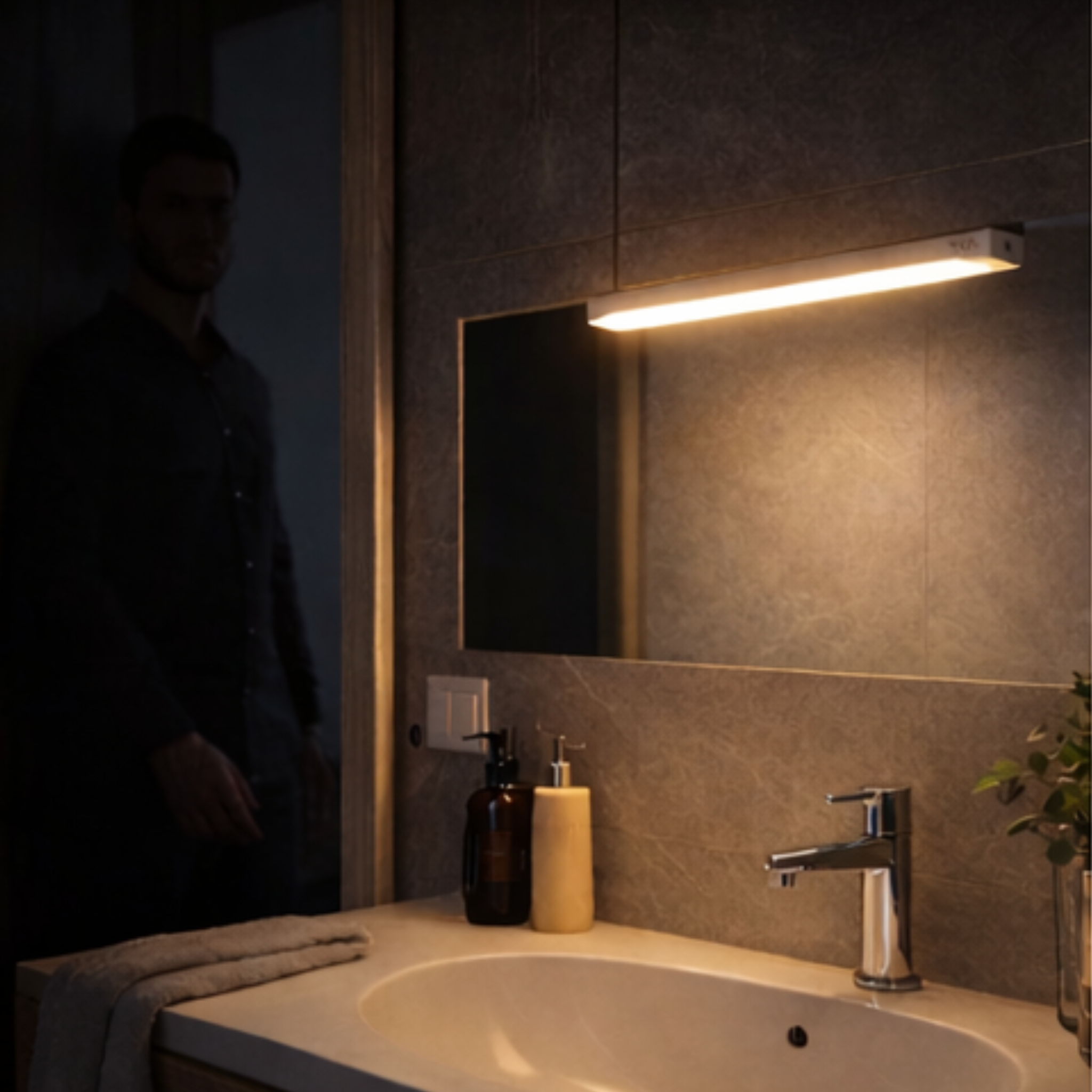 Luz LED con sensor de movimiento ideal para debajo del gabinete, armarios, cocina, alacenas, escaleras, pasillos y más. Su diseño compacto y moderno permite iluminar cualquier rincón oscuro de forma automática y eficiente.